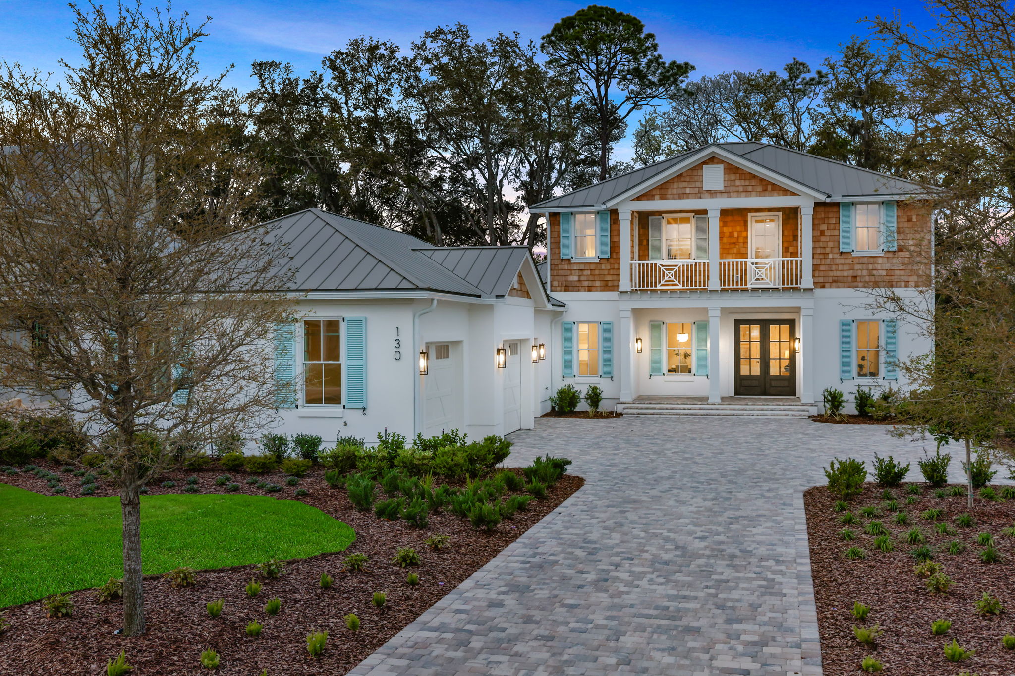 Designed in a Coastal Bahamian Classic style, this luxury home showcases timeless architecture with shake siding, a standing seam metal roof, and iconic Chippendale balcony details. Copper gas lanterns create a warm, inviting glow, enhancing curb appeal and coastal elegance.