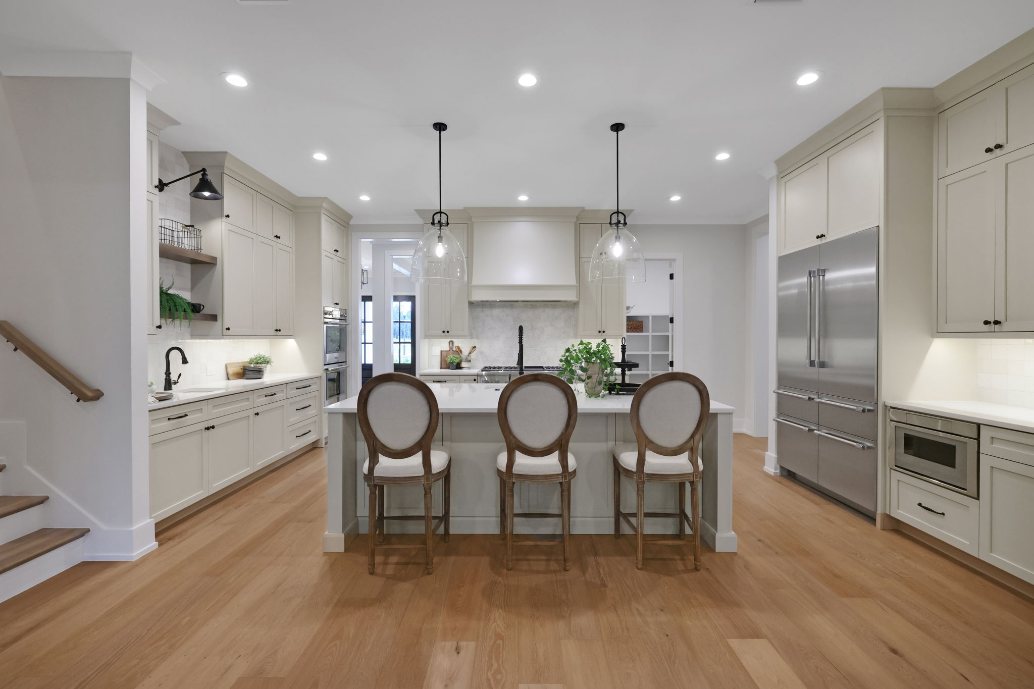 Inside, 11-foot ceilings and wide plank wood flooring create a bright, open feel. The thoughtfully designed floor plan includes primary and secondary bedrooms on the first floor, plus an oversized 3-car garage for added convenience. The gourmet kitchen is a true centerpiece with premium Thermador appliances, custom white cabinetry, a natural wood island, and designer brass lighting.