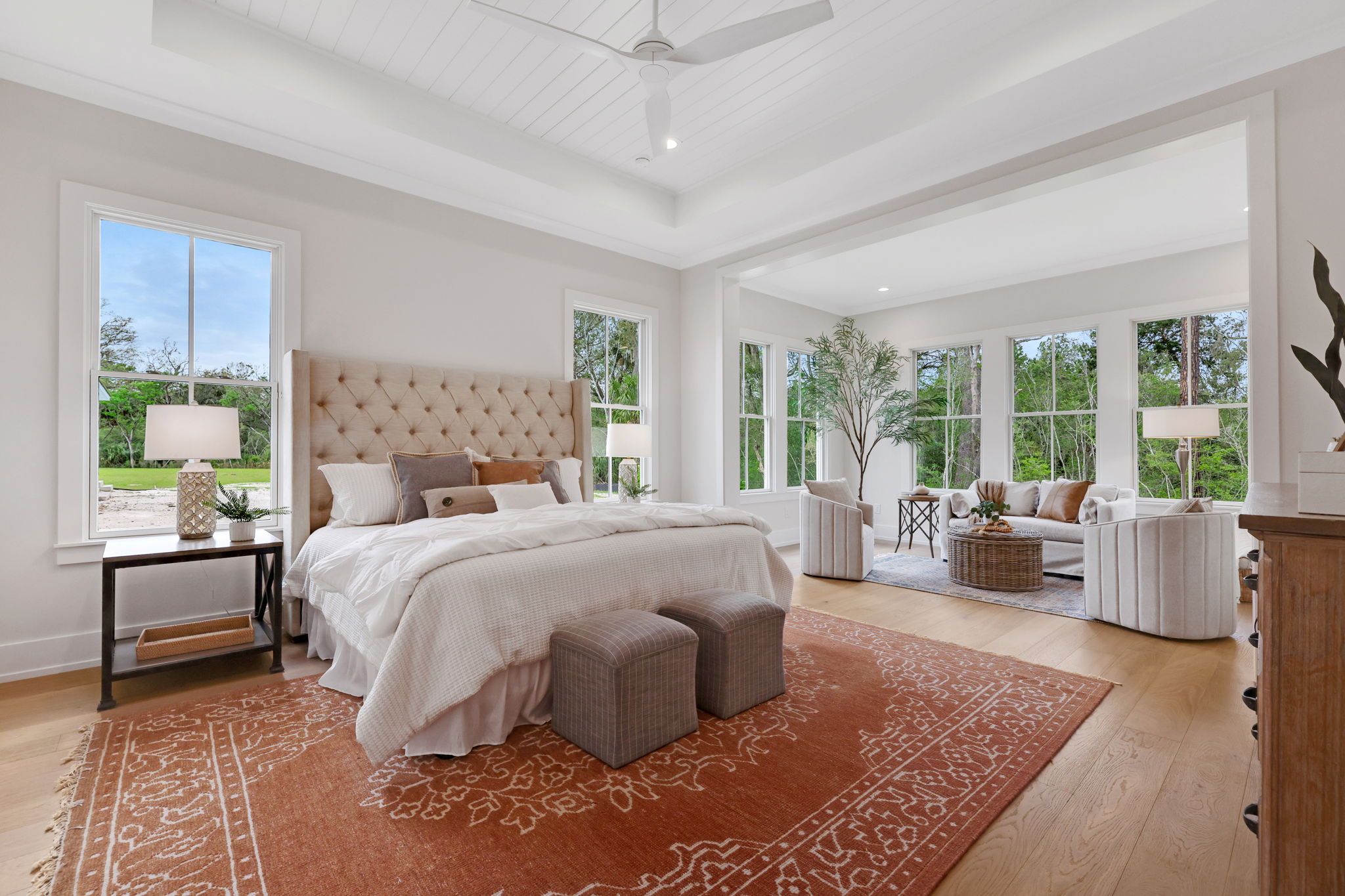 Inside, a transitional modern farmhouse interior features curated designer finishes and an open-concept layout. The chef’s kitchen is equipped with premium Thermador appliances, blending beauty and functionality for everyday living and entertaining. A dedicated wine room adds a refined touch, perfect for hosting or unwinding.
