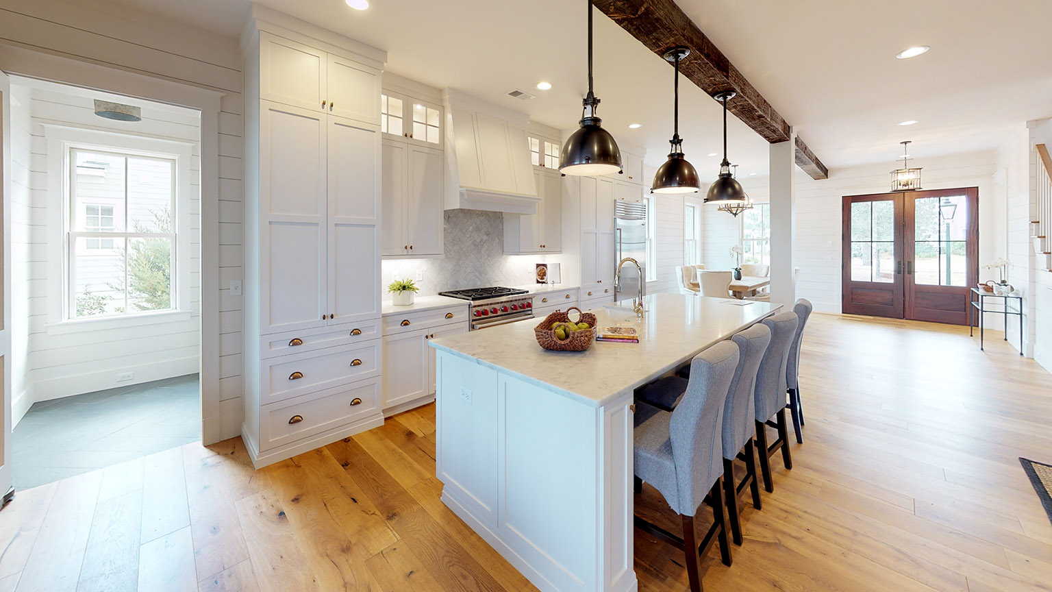 The interior of the Four Five custom home exudes charm and sophistication. Flex spaces throughout the home offer versatility, catering to your unique lifestyle. Wood ceiling beam features add character and warmth, creating an ambiance that’s both inviting and timeless. Shiplap features further enhance the aesthetic, combining modern design elements with a touch of rustic elegance.